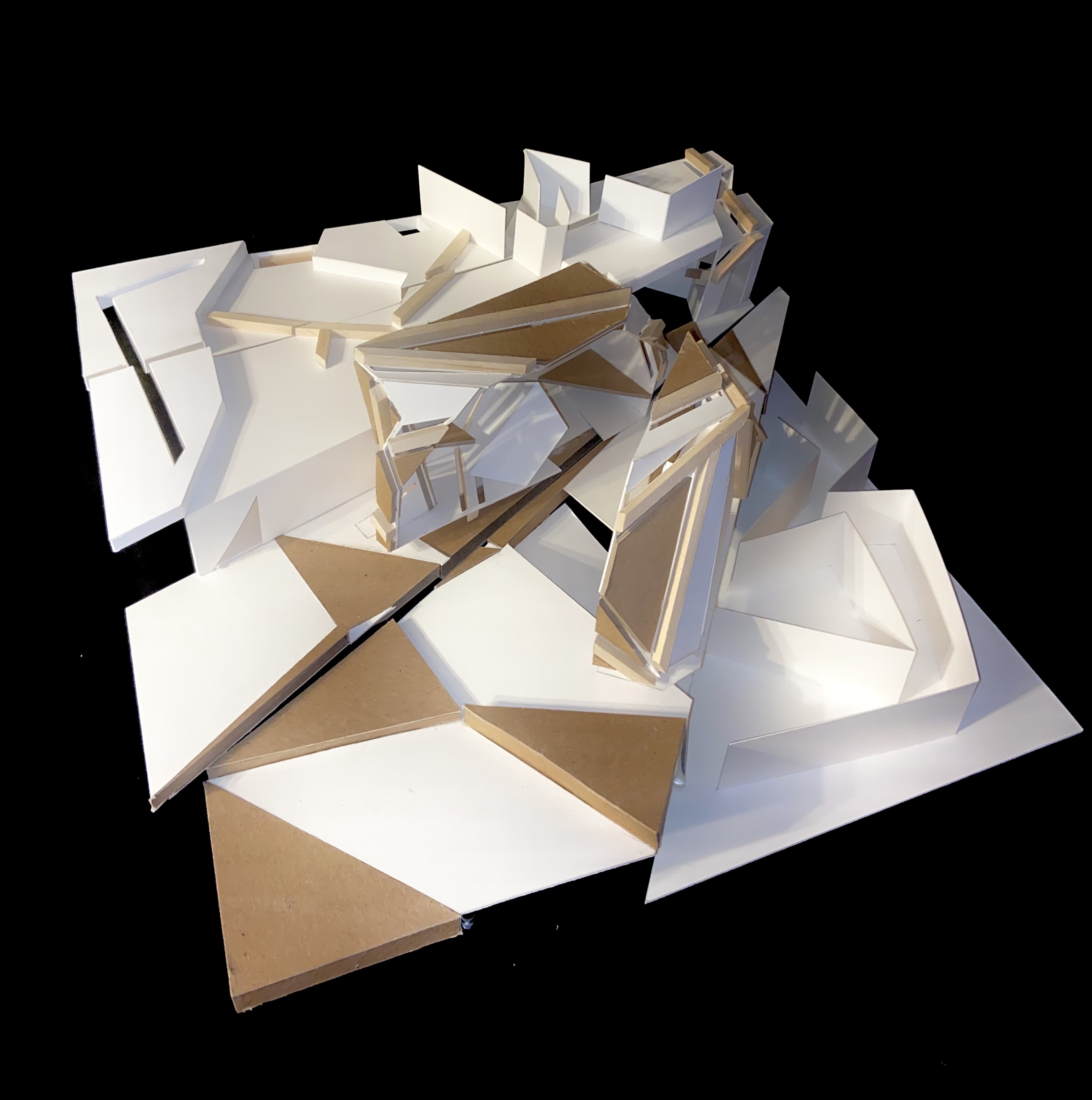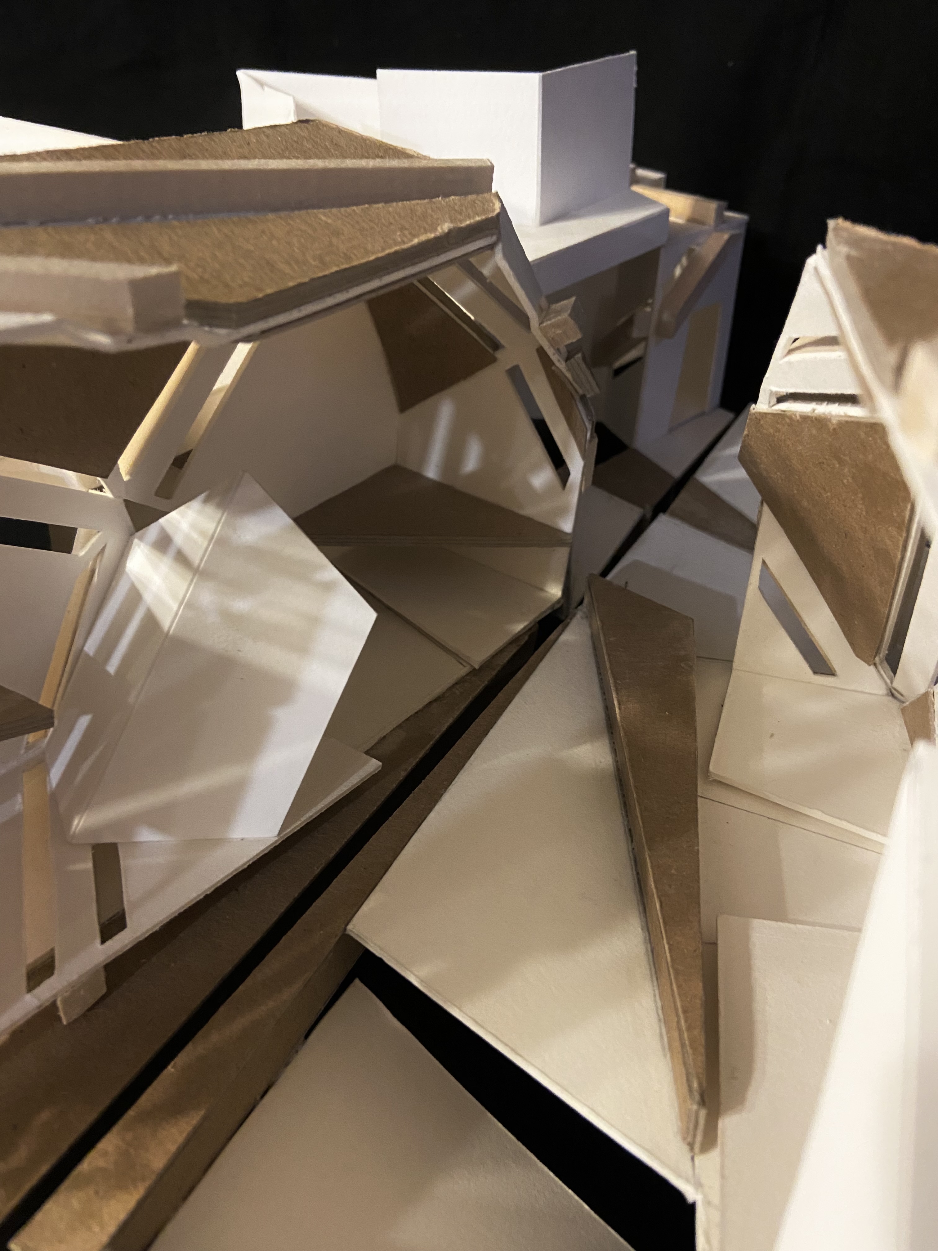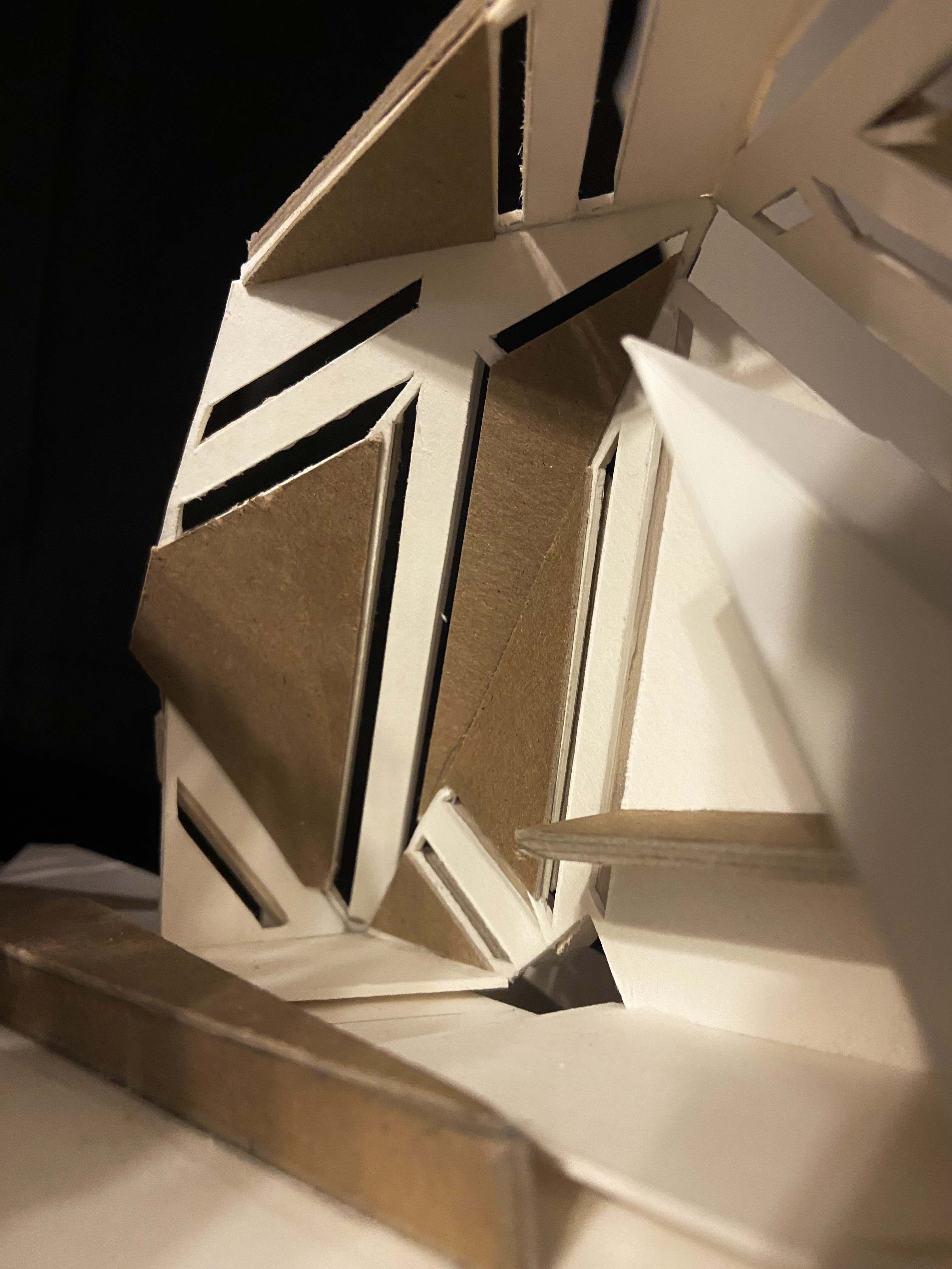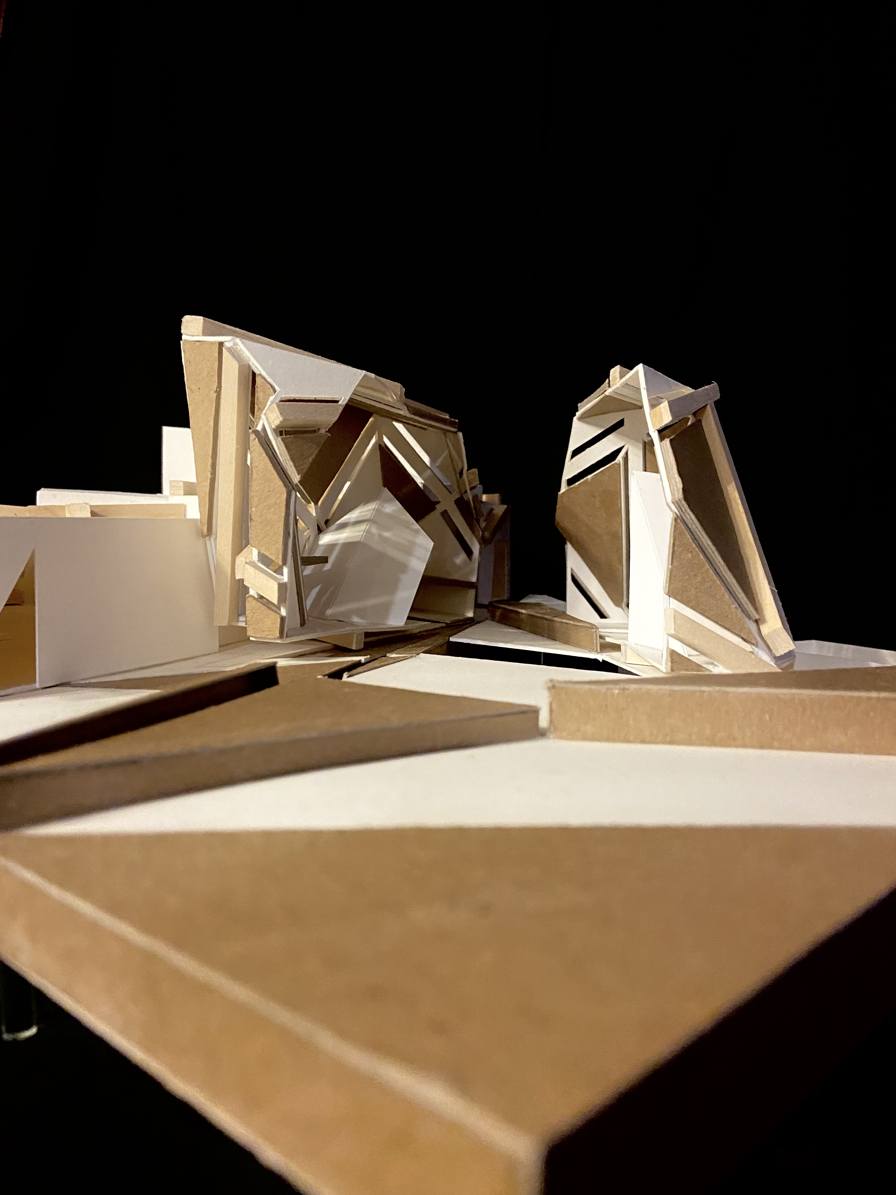 Photos of the physical models of the landscape. It is a sectional model with the same cuts shown in the experimental drawing. The materials used were museum board, chipboard, and basswood sticks.