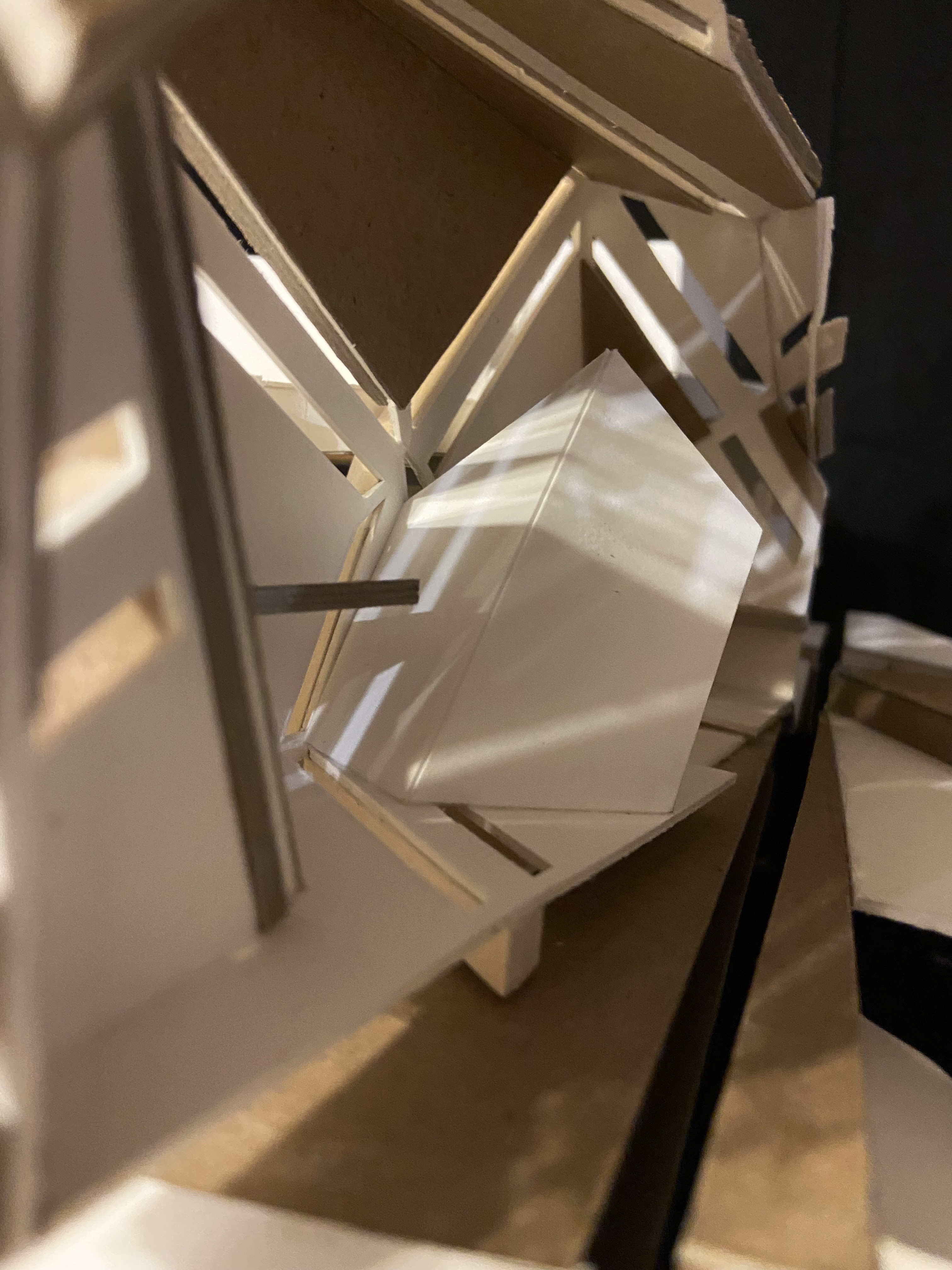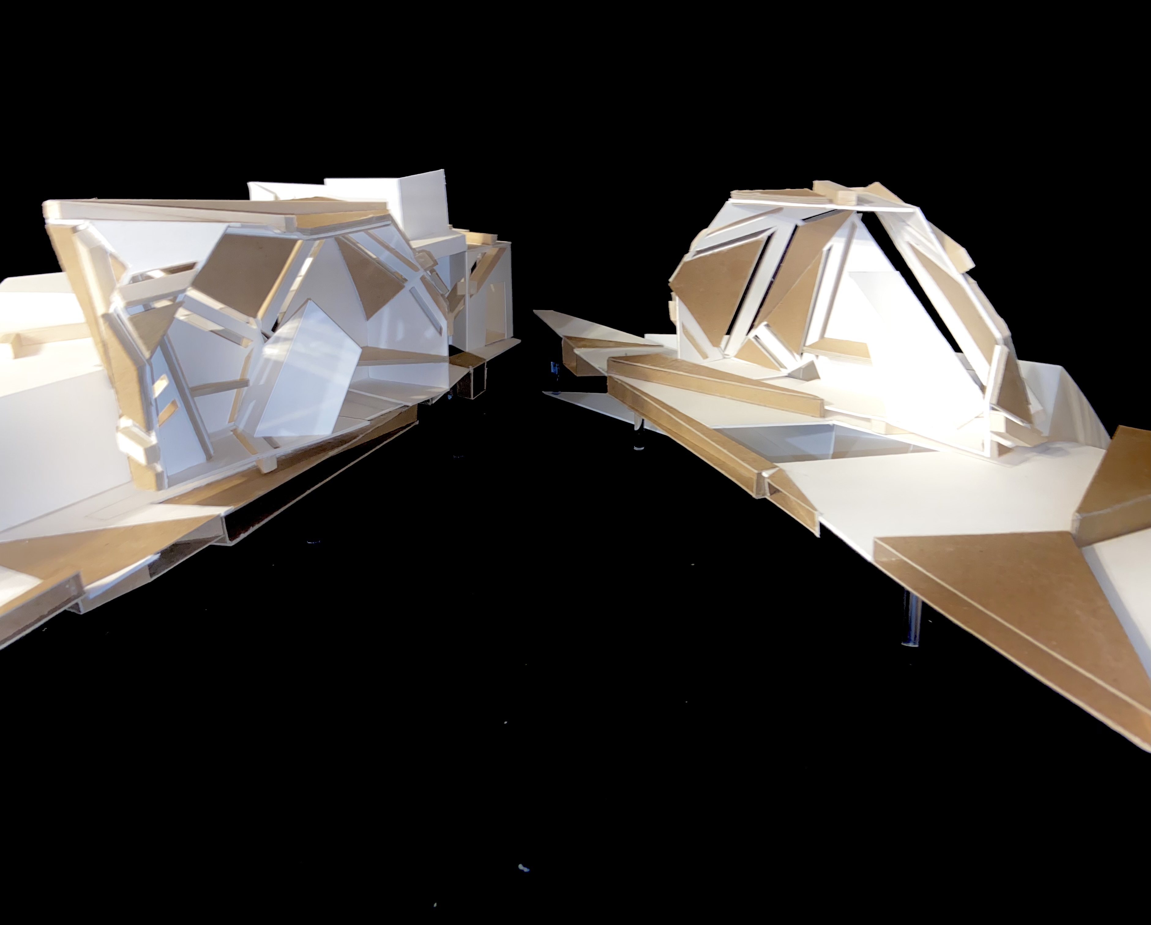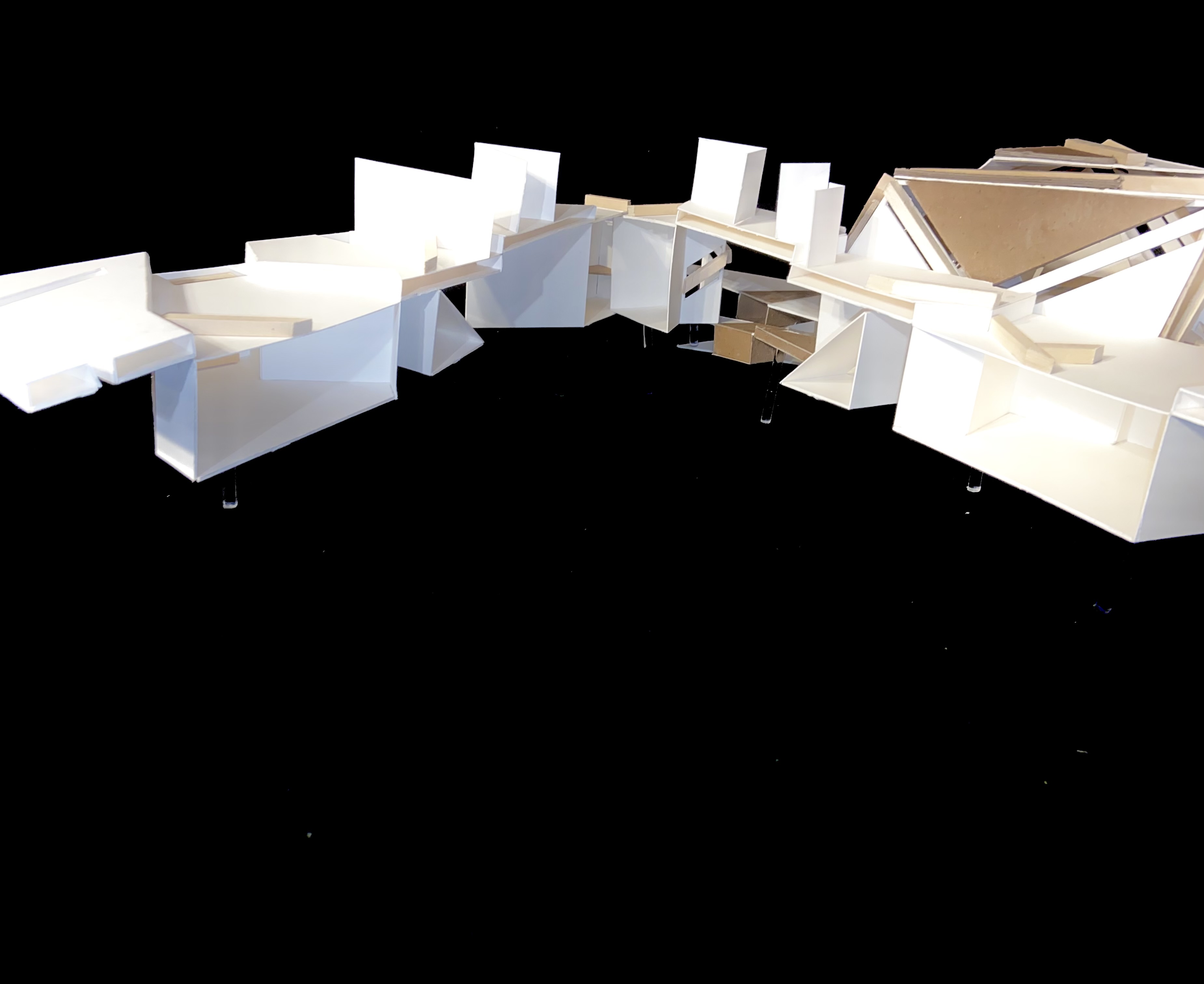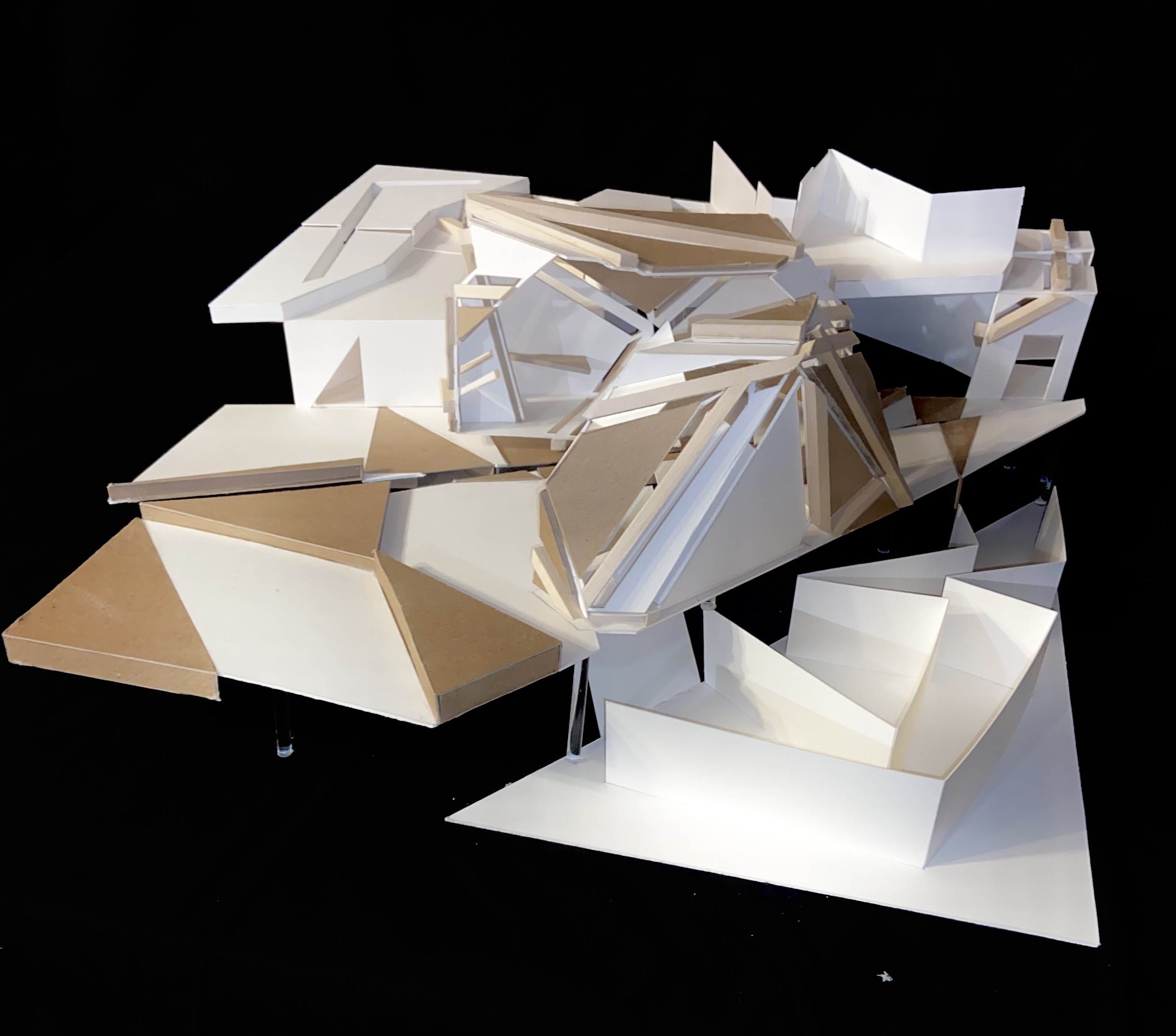 Photos of the physical models of the landscape. It is a sectional model with the same cuts shown in the experimental drawing. The materials used were museum board, chipboard, and basswood sticks.