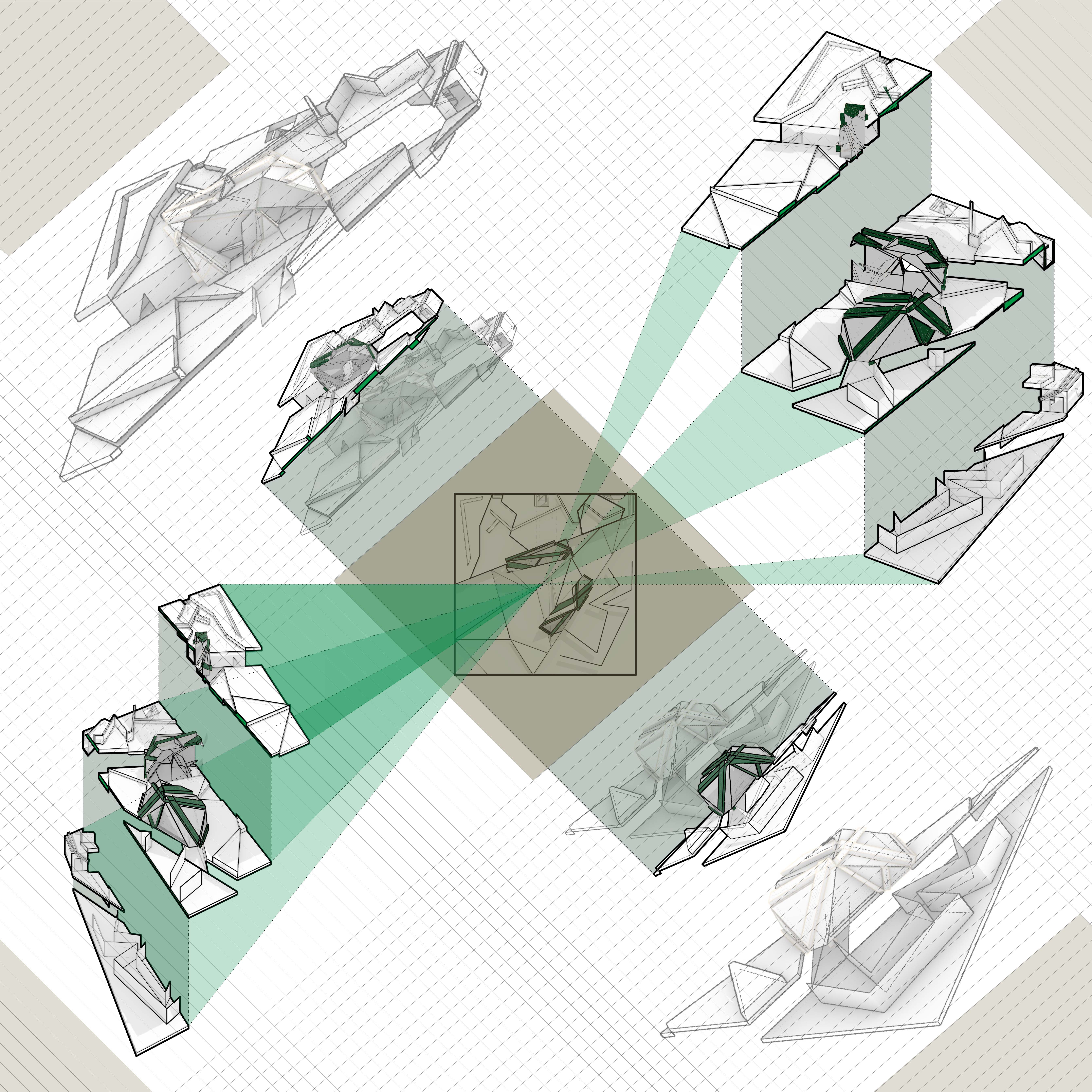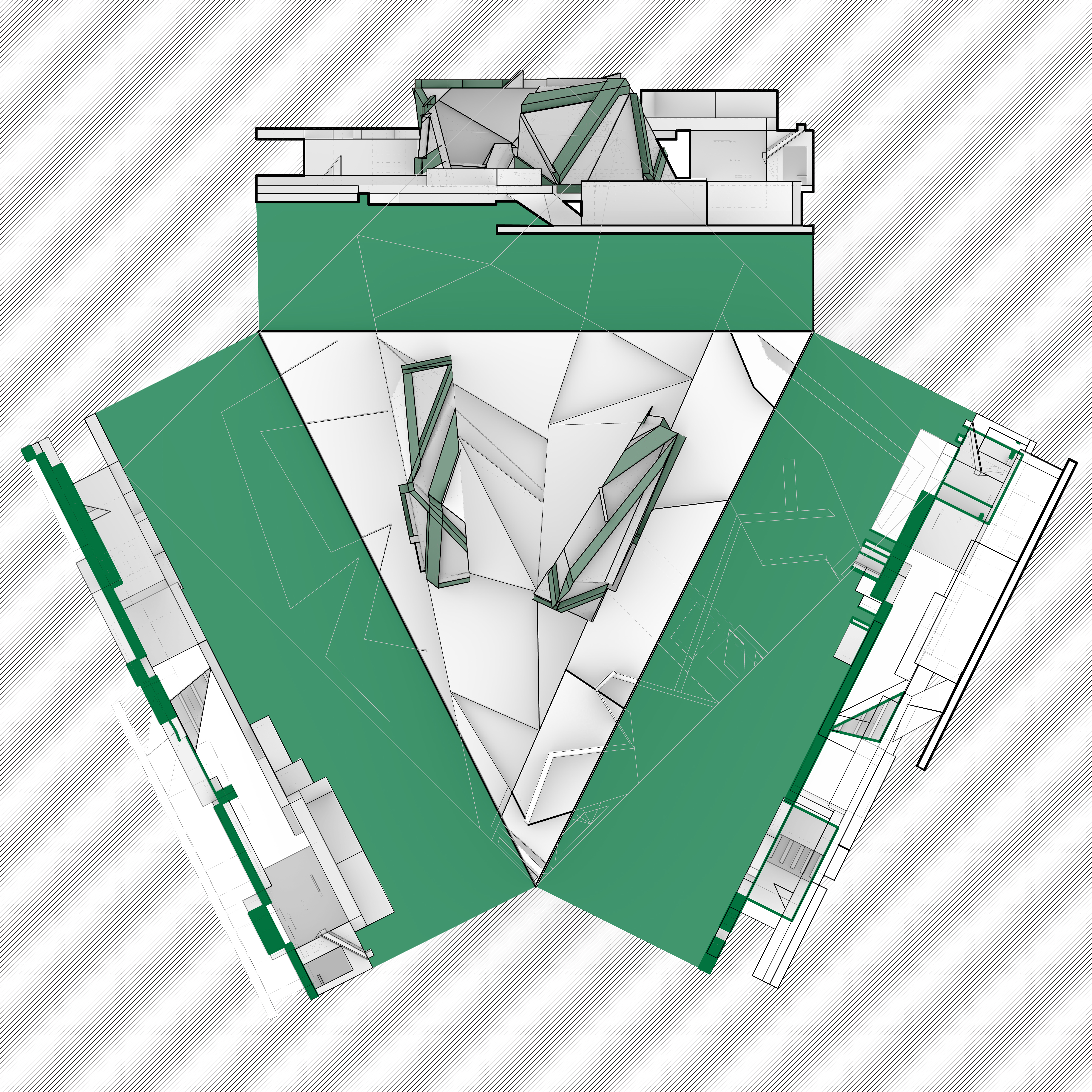 Orthographic projection drawing of final design 101 project: The plan view is the triangle in the middle, spreading to the underlaid square intersecting with the elevations and sections. The parameters of this piece is 21’x21’x15’, with the physical model at half inch scale and the drawings at quarter inch scale. The project is abstract and meant to make the inhabitant feel uncomfortable when walking through the space.