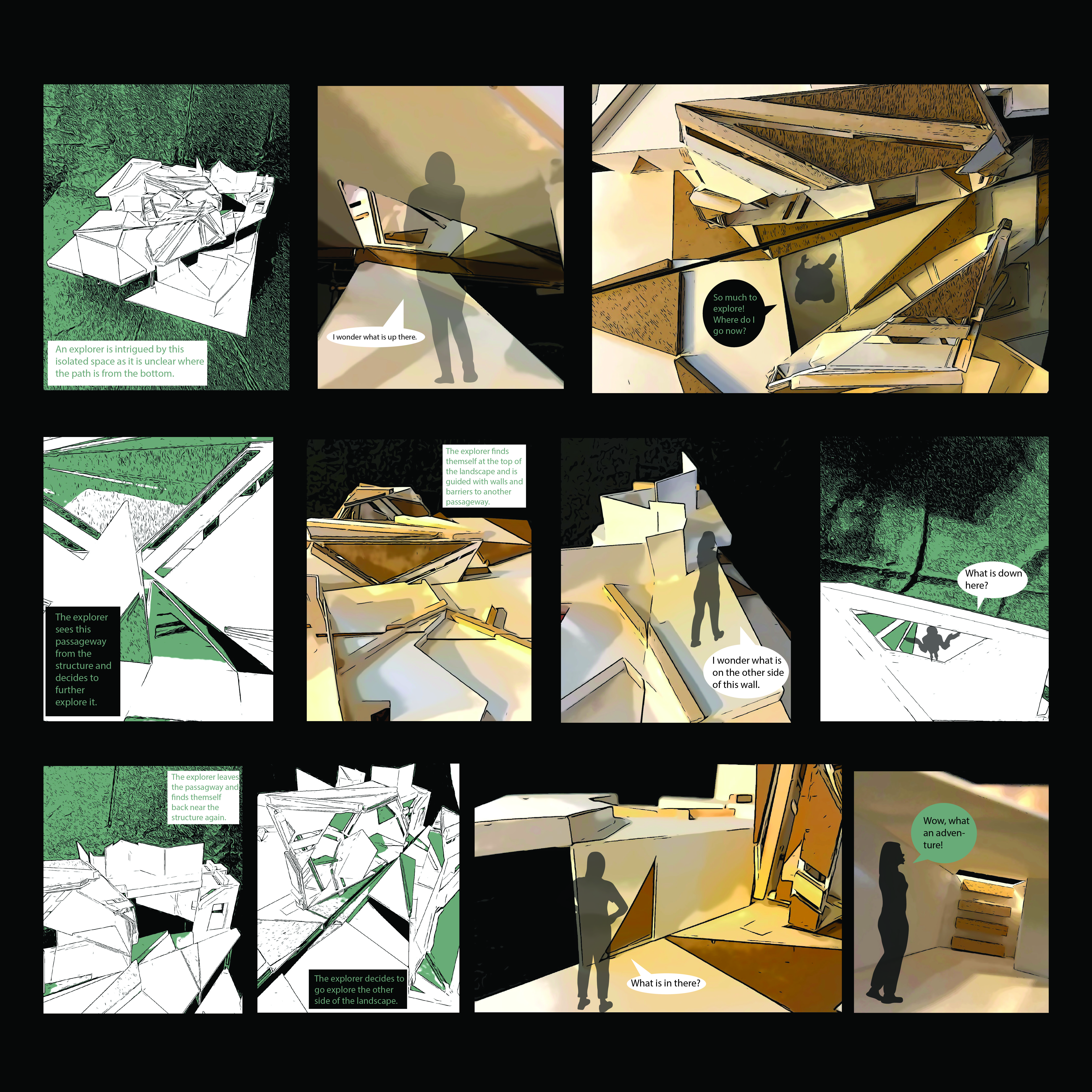 Comic strip showing the experience one would go through if they were to walk through the landscape. It shows all of the guiding ramps and walls, and the hidden passageways in the project.