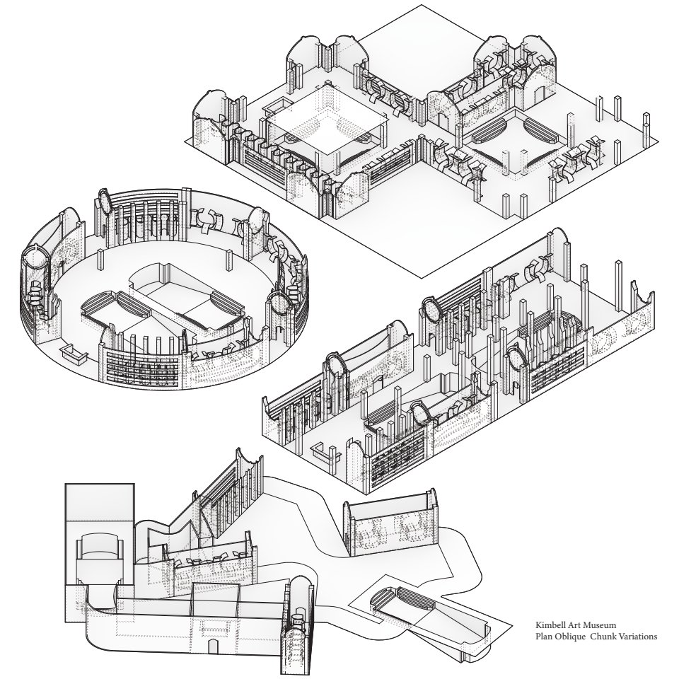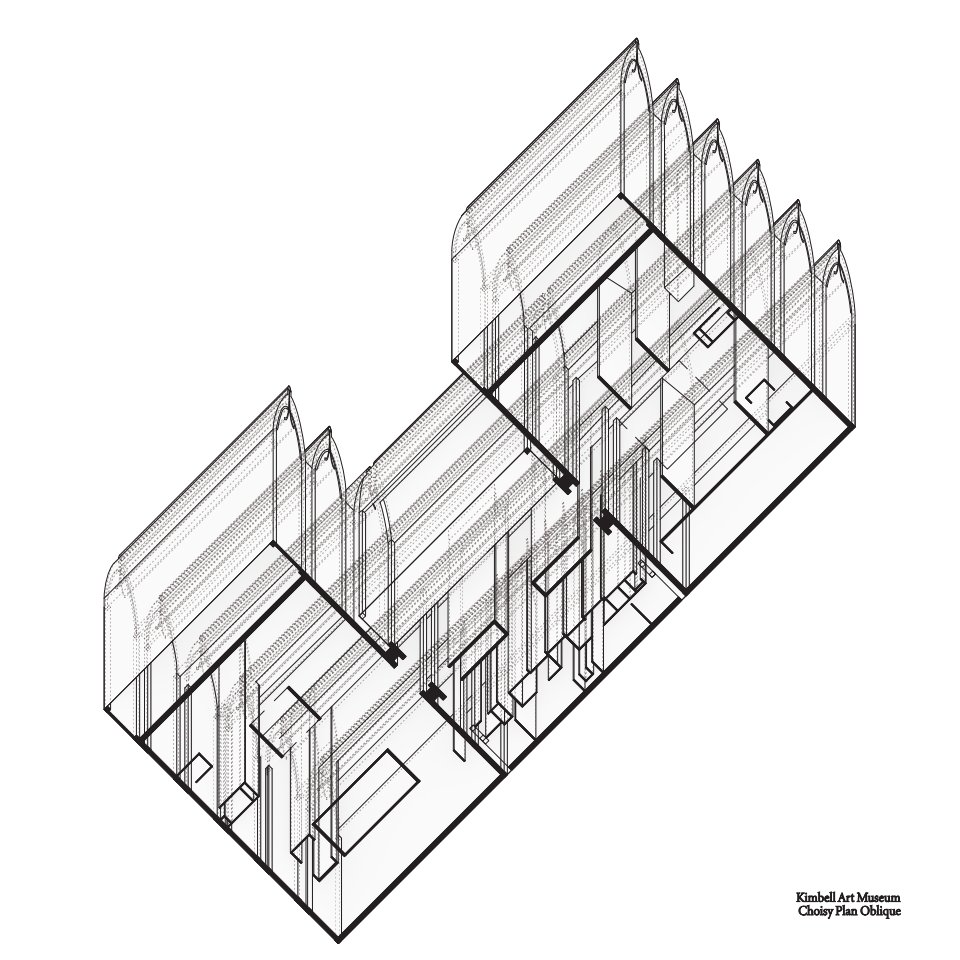 Choisy plan oblique drawing of the second floor of the Kimbell Art Museum, depicting the spatial volume, as derived from its walls, supports and organizing roof.
