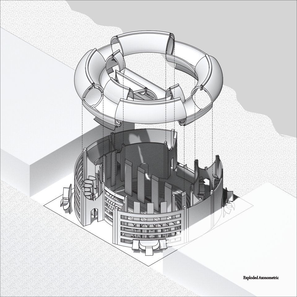 Exploded roof axonometric shows which type of roof goes above each program space, and the circulation from the front of the building/street to the back of the bath house where it connects to the beach front.