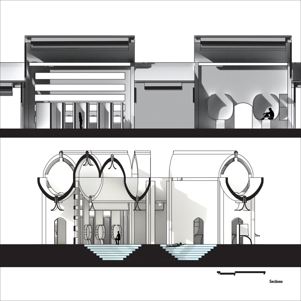 Two sections showing the repetition of the roof system , the interior program spaces and the interior exterior relationship throughout the space. The stall walls and the sauna benches are directly derived from the geometry of the Kimbell Art museum barrel roof.