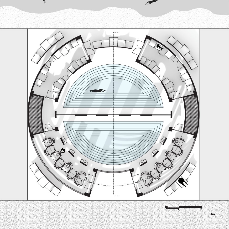 Plan drawing of a bathhouse based on the roof and geometry of the Kimbell Art Museum. The barrel roof of the Kimbell Art Museum is altered to curve around a central pool area as well as dip below and above a central horizon line based on the program space below it. The program includes changing rooms/bathrooms, shown by the egg shaped stalls. These stalls wrap around the indoor pool and lead to a passageway next to mechanical rooms that lead to the saunas. Ths sauna side is connected to the outdoor pool and has a connection to the beachfront.