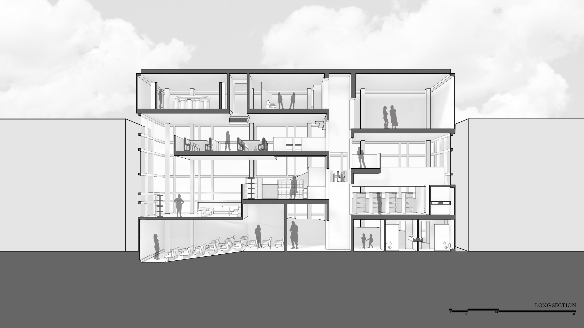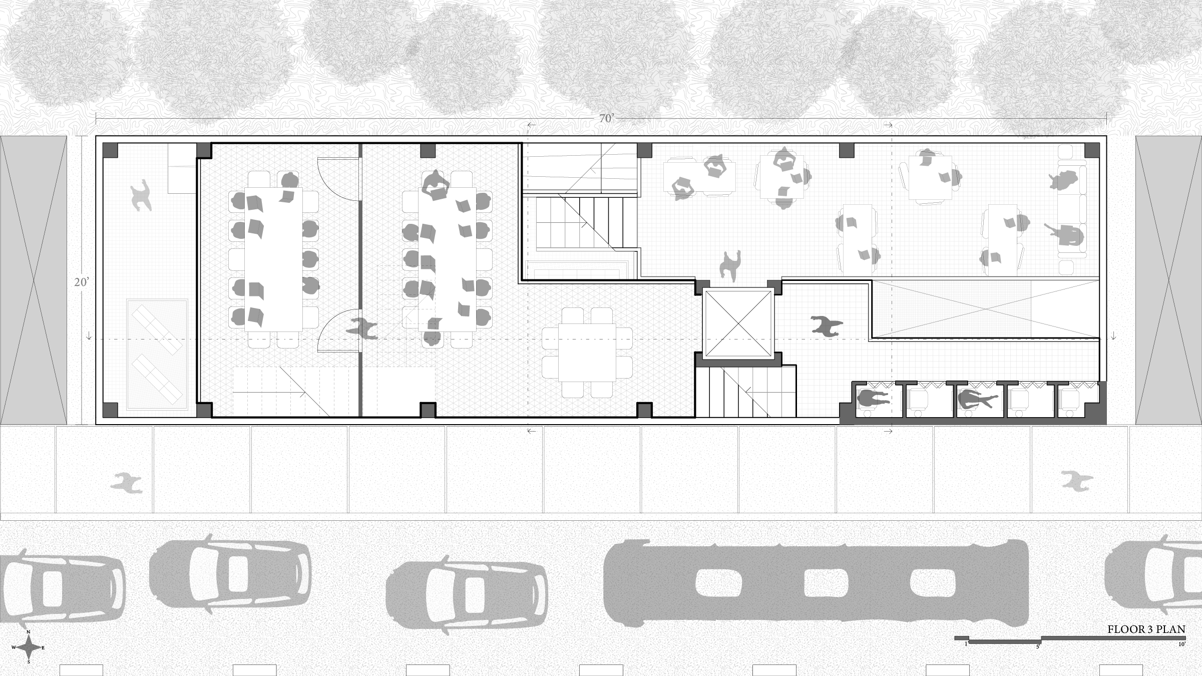 Third floor plan of proposed building (parameters of 70'x20') :: Third floor includes meeting spaces, private viewing booths, a work study area, and leisure/circulation spaces that overlook each other