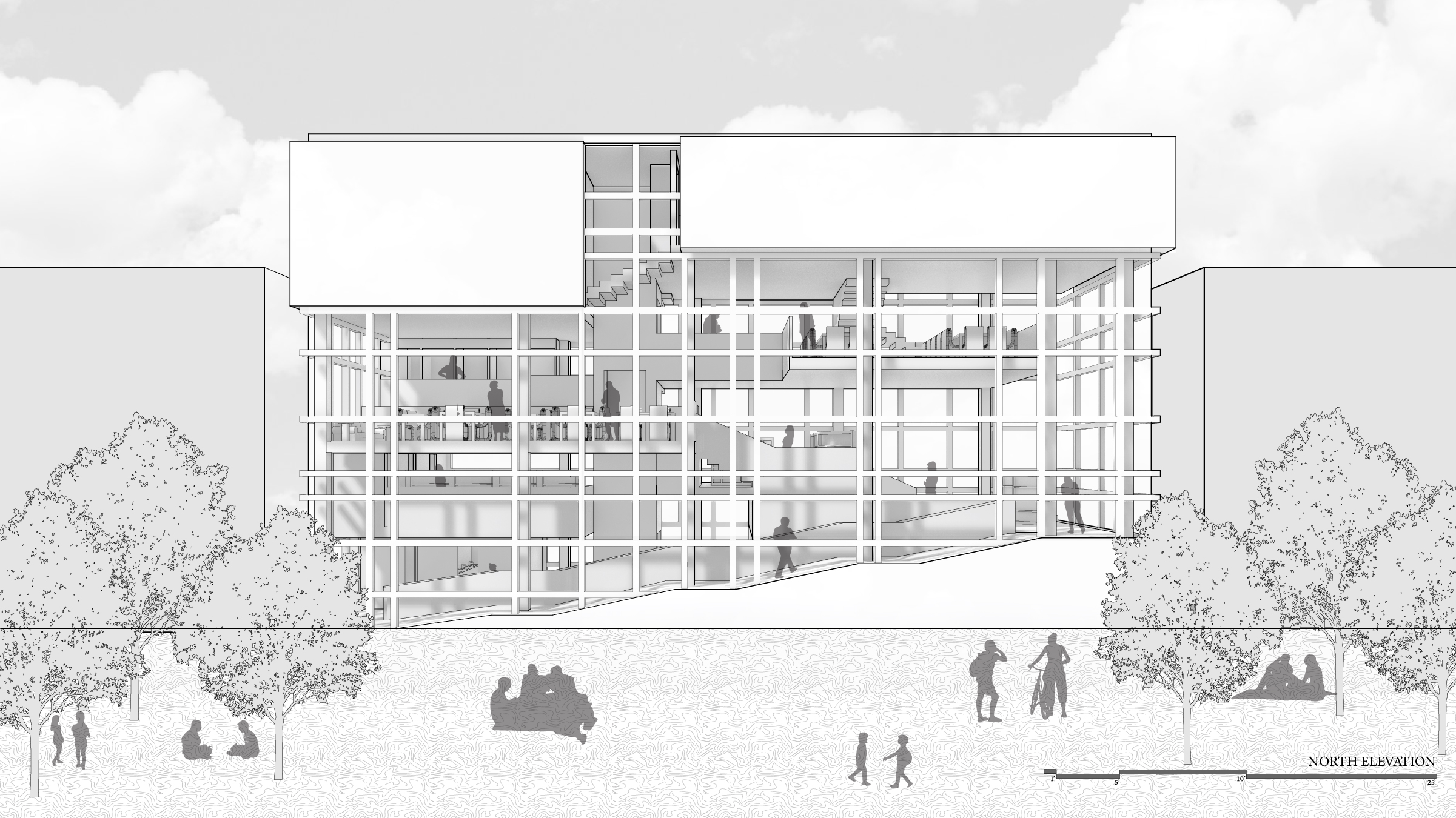 Ground floor plan of proposed building (parameters of 70'x20') :: Ground floor includes a theatre, lavatories, and the entrances to the building, the interior ramp, and interior elevator