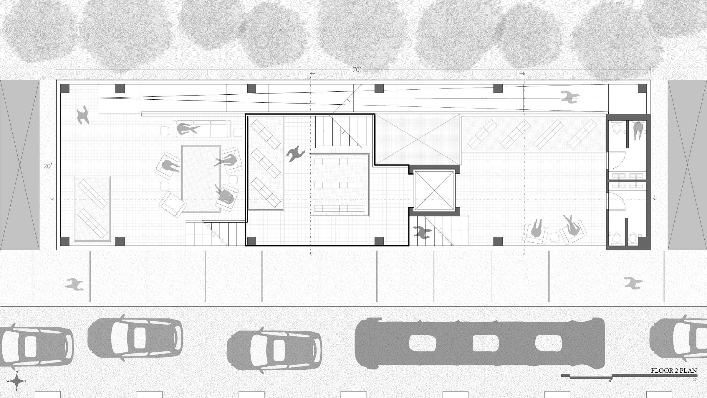 Second floor plan of proposed building (parameters of 70'x20') :: Second floor includes storage shelves for books, CD's, DVD's etc., lavatories, and leisure spaces that overlook each other