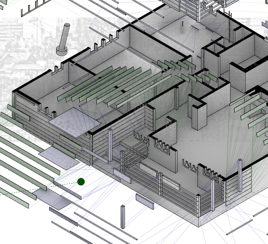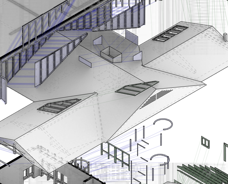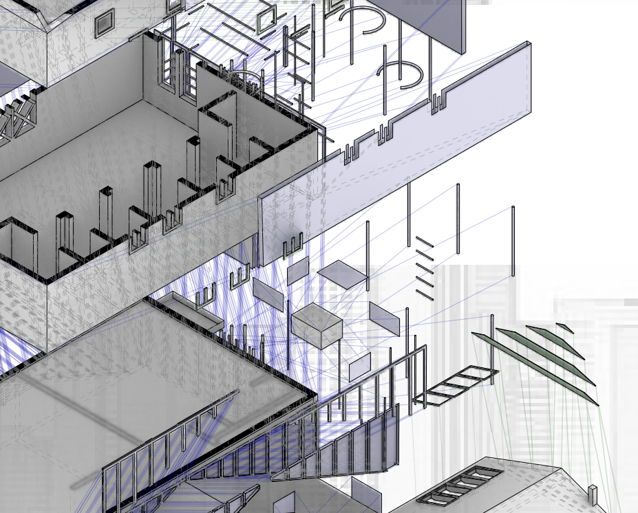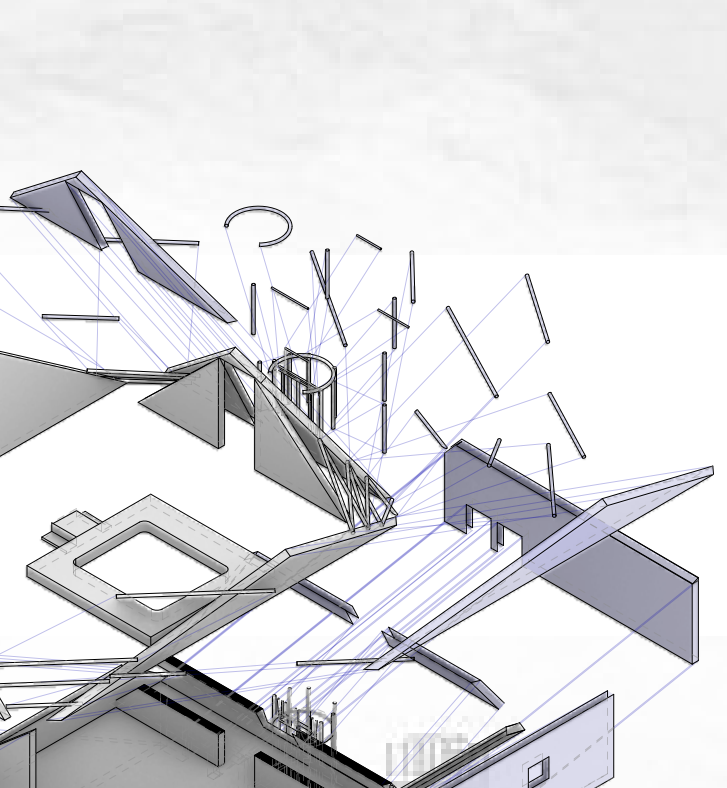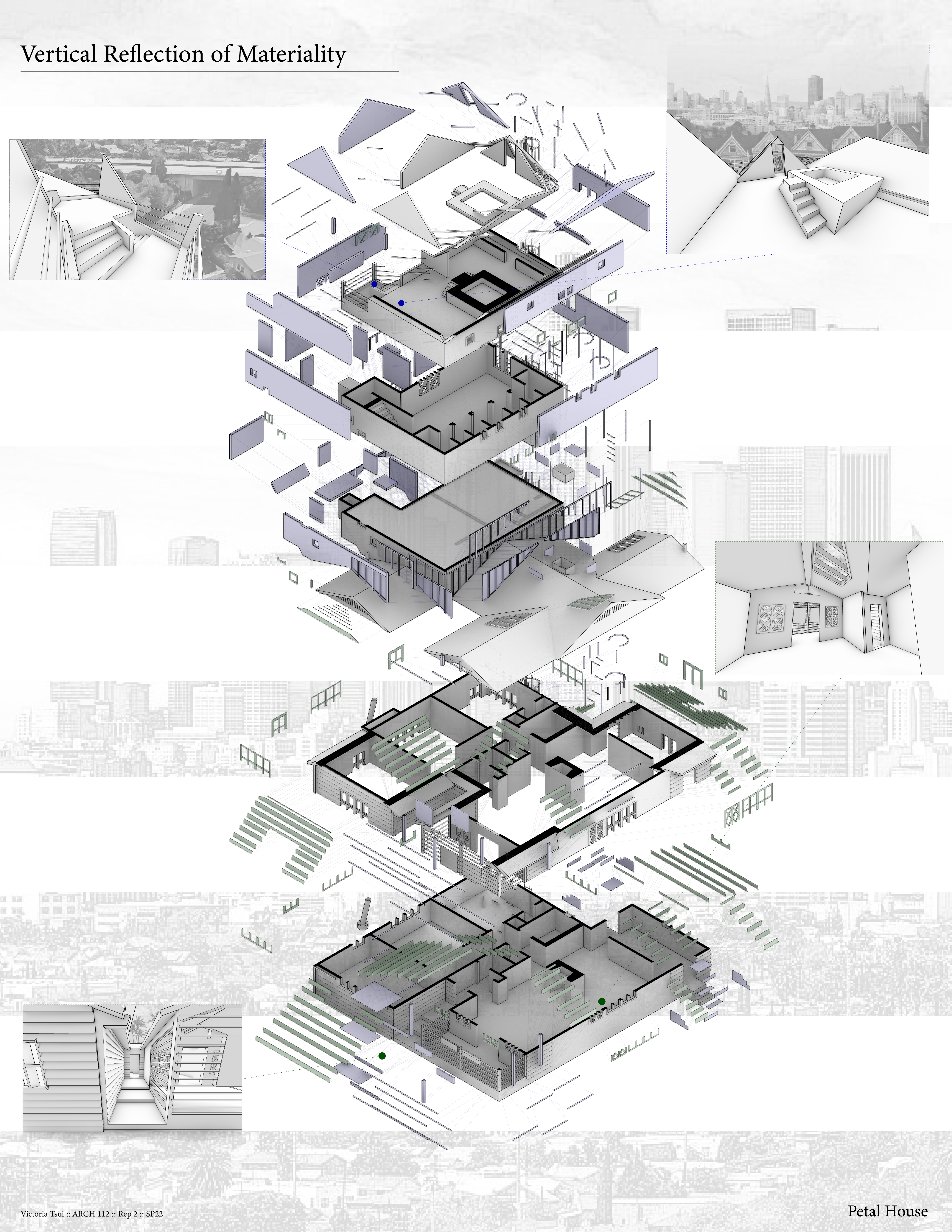 The vertical materiality of the Petal House is reflective of the vertical materiality of its environment, Los Angeles. The vertical relationship of materials is reflected through the house with the softer materials and vegetation at ground level, shifting to industrial unnatural materials up above. From ground level, there are suburbs and palm trees. As you ascend, the environment changes to a more industrial world with skyscrapers and elevated highways. The highways and skyscrapers poke out from the suburbs, just as the Petal House pokes out from the trees surrounding it. The house also reflects the environment based on the material choices. From bottom to top, the house goes from formal materials to newer, industrial materials. On the bottom of the house, there is traditional siding and window frames that you would see in a regular suburban home. This is reflective of all of the traditional tract homes surrounding it at ground level. As you move upwards, to the renovations and additions, there is asphalt, rebar, and exposed wood, which a “normal” home wouldn’t have. This is symbolic of the Santa Monica Freeway above the neighborhood it resides in. It is symbolic of the changing society and push towards a more industrial future. The Petal House is like a mirrored reflection of the city of Los Angeles. Moss also uses interesting choices to block the sights of the inhabitants. From the bottom floor, the person inside sees the more traditional trees and suburbs. The rebar blocks this view and the circulation, like it is trying to block the person from going into the suburban area. This is similar to the roof because you can see everything from the roof, but the only way down is through a staircase in the house, or a metal cylindrical ladder that would be uncomfortable to go down. It is almost as if he is taking away the freedom he created with the openness of the petals on the roof. This can be a message of keeping people sheltered from these changing times, or even, trying to block out this evolving society. The Petal House may stick out like a sore thumb, but it is truly the only house that visually represents its environment. The Petal House is a powerful symbol of industrialism stripping away our freedom.
